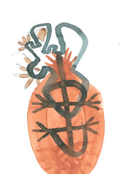 Projekt DOS in Zusammenarbeit mit Margret Lochner: zwei Künstlerinnen arbeiten nacheinander auf dem gleichen Blatt. Jeweils eine gibt eine figürliche Form vor, die die andere intuitiv in ihrer Formensprache und Handschrift zu einer neuen Figur vervollständigt. Diese ist meist mehrdeutig, enthält häufig komische Elemente und lässt vielfältige Assoziationen zu.